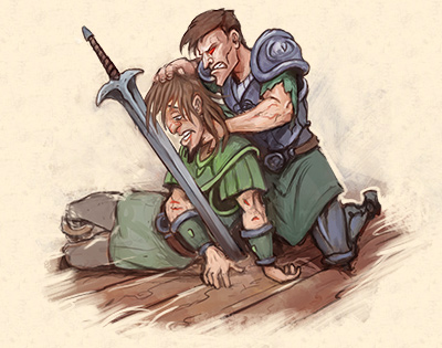 Esses dois paladins eram capangas de Beefo. Um deles colocou o corpo impotente de Fridolin sobre os ombros enquanto o outro pegava apressadamente o ouro espalhado.