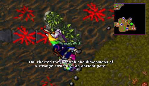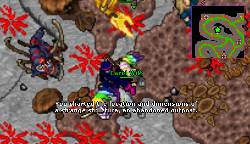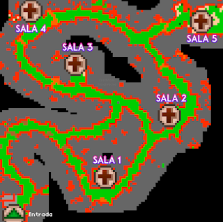 Desça a escada da imagem acima e suba na próxima, logo ao sul. Você estará na entrada, como no mapa abaixo. Siga até o extremo sul-direita, na estrela verde. Tenha cuidado, pois terão muitas criaturas pelo caminho.