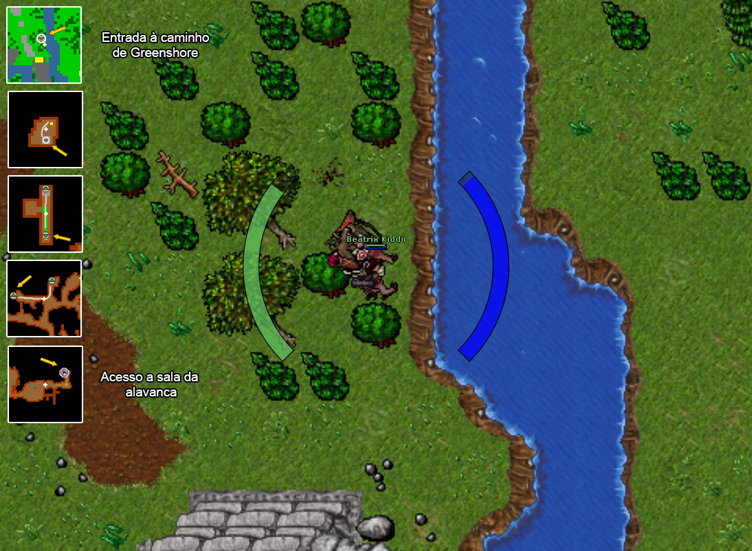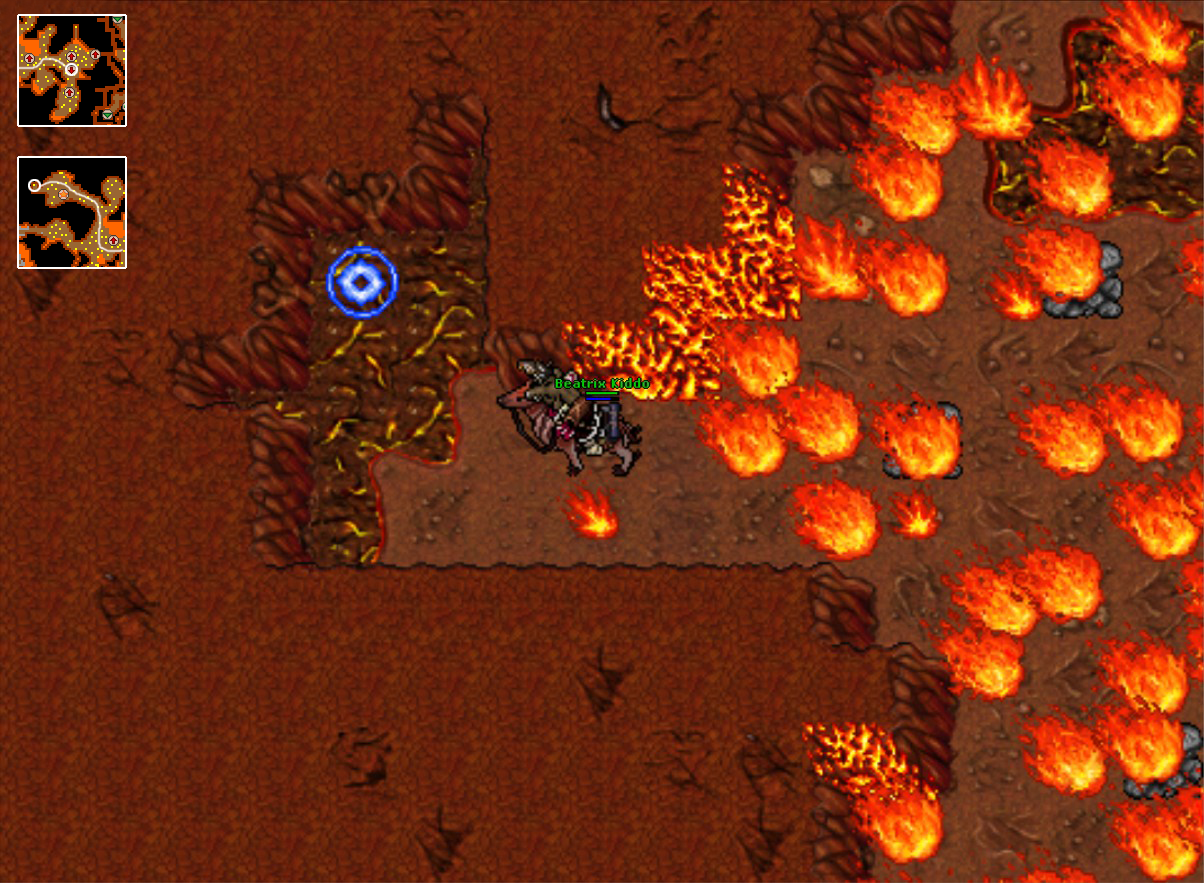 O próximo desafio está em Plains of Havoc, mais especificamente, no Dragon Lords de Pits of Inferno. Para acessar esta área pelo atalho, você precisará ir até a entranda da Necromant House, pelo subsolo, usar uma pick no local secreto para acessar a tumba, usar 1 vial of Blood na lápide, passar pelas magic walls com 1 The Holy Tible na backpack, atravessar a porta, descer o buraco e usar 1 vial of Oil na alavanca, para liberar a ponte. Desça o buraco ao sul e estará nos Dragon Lords de Pits of Inferno. Na caverna, siga as instruções da imagem.