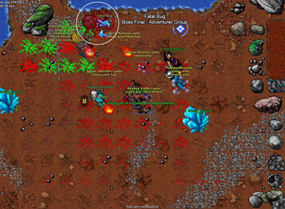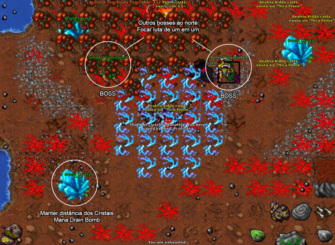 Além dos bosses, existem alguns Bright Crystals na sala. Evite bater neles também, pois de tempos em tempos, após alguns danos sofridos eles causam uma explosão de mana drain bem forte, que pode prejudicar consideravelmente a luta.