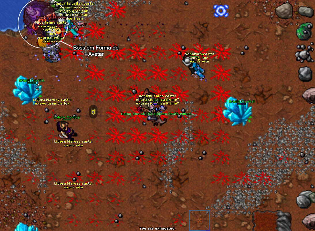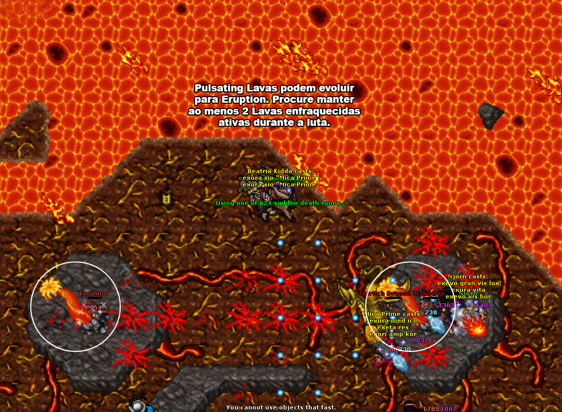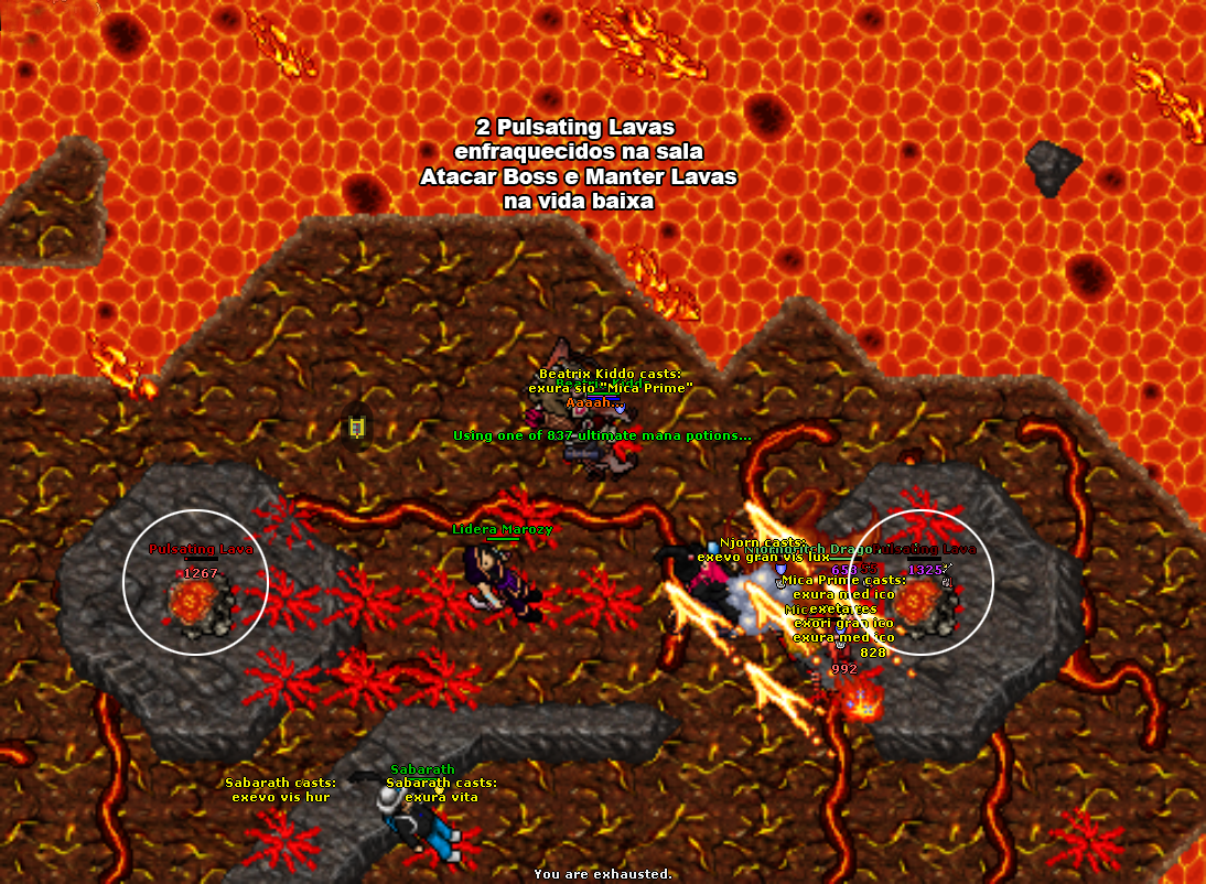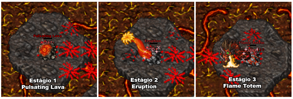 Essas estruturas causam dano de fogo ao redor de si mesma, algo como um exori. Como o boss se cura com dano de fogo, procure deixa-lo sempre a uma distância de 2 sqm, das Pulsating Lavas e suas variações.