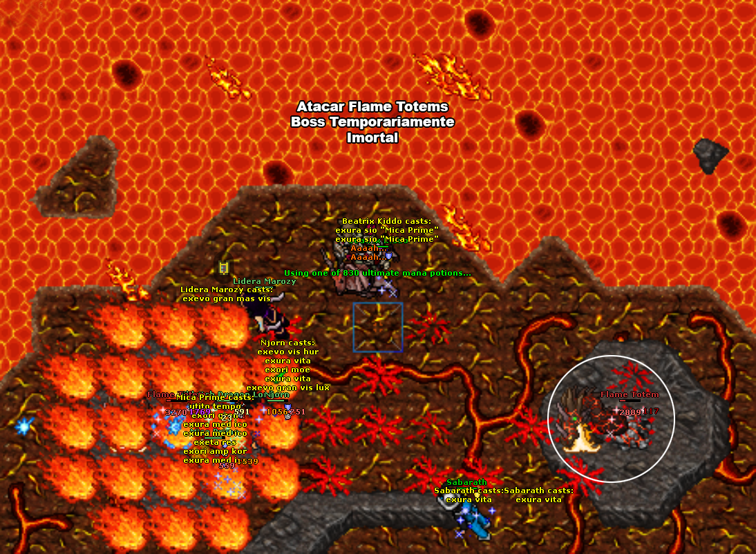 Em aproximadamente três momentos da batalha, quando a vida do boss baixar, todos os Pulsating Lavas se transformarão em Flame Totems, com vida total. Procure baixar a vida deles novamente.