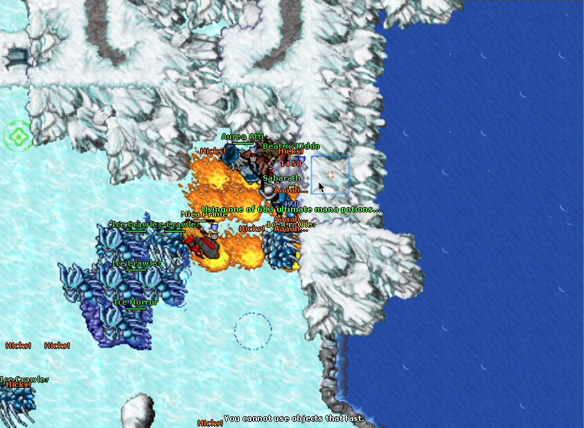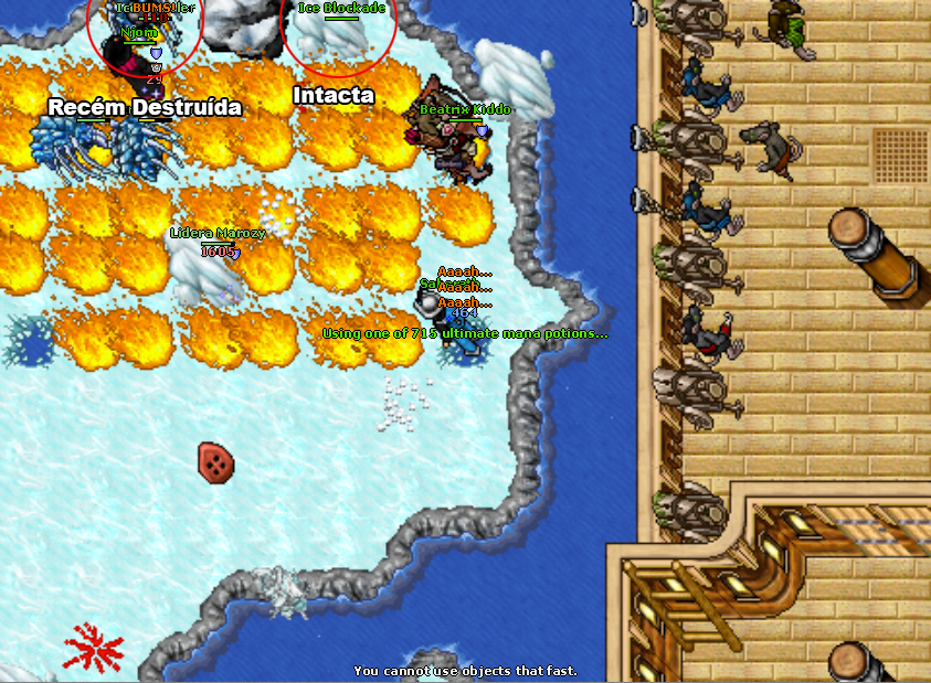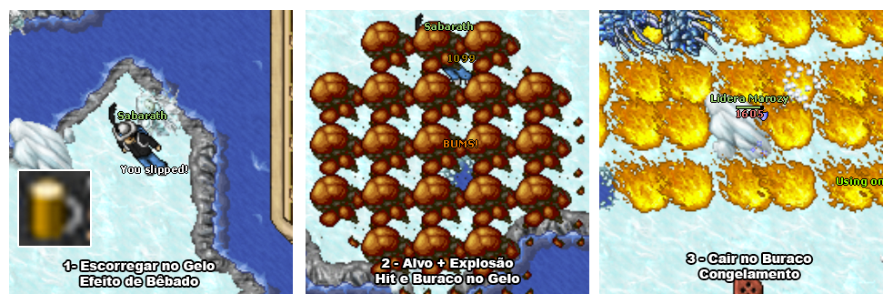 Enquanto você está dentro da sala, algumas situações podem acontecer: você pode escorregar no gelo, o que ter deixará bêbado; um alvo vermelho será marcado no seu personagem, causando uma explosão. Quando este alvo aparecer sob seus pés, mova-se rapidamente, pois a explosão fará um buraco neste sqm, o que causa efeito de root e pode até te congelar se você “cair” nele.