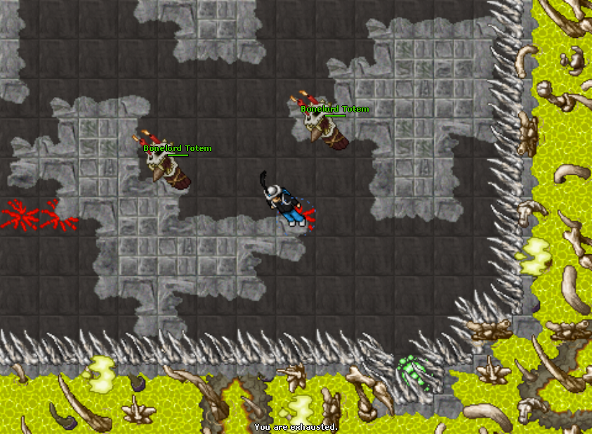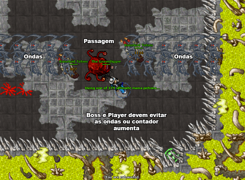 De tempos em tempos, aparecerem totens espalhados pela sala, que dificultam ainda mais a movimentação e ainda causam efeito de drunk. Por isso, para essa batalha, recomenda-se o uso de Dwarven Ring.